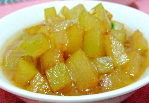 做法:冬瓜去皮去瓤切成25px见方的小块备用,姜末;锅里加比炒菜稍微多一点点的油烧热后扔姜末炸香后倒入冬瓜块翻炒一分钟后改中小火满炒2分钟,略加水,盐,鸡精,酱油再小火焖至冬瓜酥烂即可.