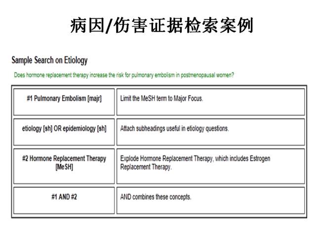 1确定临床问题 Define your question.加拿大MacMaster大学的Hynes教授把临床医学问题主要归类为五大种类:1)治疗问题2)诊断问题3)病因/伤害问题4)预后问题5)指南2选择检索的Mesh词 Select MeSH terms that best represent your concepts.