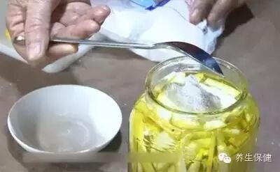 然后倒入没过柚子皮的清水,再加入一小勺食用碱。↓