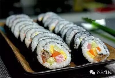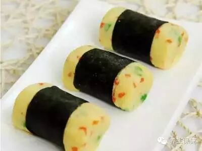 6、用寿司帘将紫菜卷起,卷好后再用寿司帘卷一次,尽量卷的紧实一点,打开;