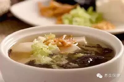 食材:干紫菜12克,北豆腐150克,瘦猪肉90克,酱油4克,醋3克,盐3克,香油5克。