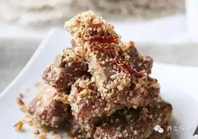 4. 然后下肉丁,炸成金黄色,肉丁有点干的样子,捞出。