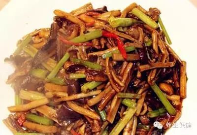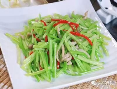 芹菜摘掉叶,洗净放开水中烫熟捞出晾凉,斜切成细丝,放入肉丝盘内,加入精盐、味精拌匀。