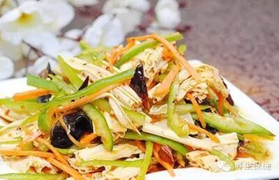 鸡脯肉切成丝,放在粉皮上面,浇入用葱末、烧沸的大豆油、精盐、味精和白糖调成的味汁,拌匀即成。