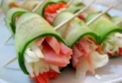 胡萝卜、竹笋、琼脂拿干水放入碗中加入味精、盐、香油调好口味,将黄瓜片平放案板上,把胡萝卜丝、冬笋丝和琼脂丝均匀地分置在各个黄瓜片上,然后一端卷成卷,即可装盘。