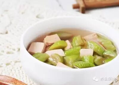 将丝瓜刮去皮,洗净,斜切成薄片。将豆腐切成片。