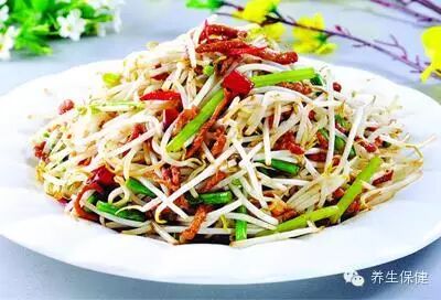 绿豆芽放入盆内,加入蛋皮丝、酱油、精盐、味精和香油,拌匀即成。