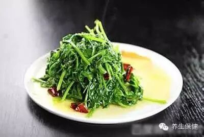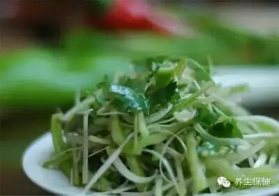 2. 锅架火上,放入油烧至七八成热,下精盐,再下豌豆苗,快速煸炒;