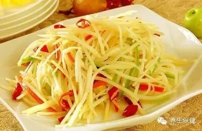 ③将烫好的土豆丝捞起,放在盆里,撒上蒜末、辣椒面(事先炸好的辣椒油也可以),不过没有现炸的香。