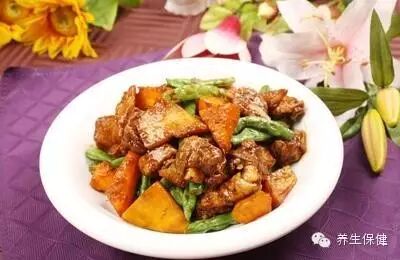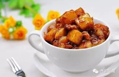 ③把2倒入高压锅,加入切好的杏脯、红枣以及泡好的枸杞,焖5~8分钟(也可以在炖锅中慢慢炖,直到土豆和南瓜熟烂)即可。