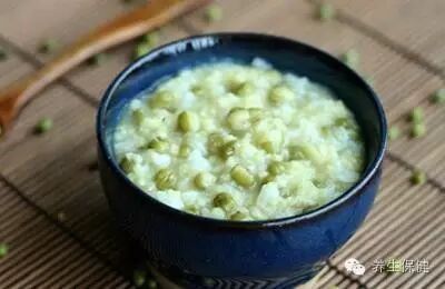 绿豆100克煮至豆皮开裂时,加入粳米50克,同煮粥,加适量白糖调味食用。