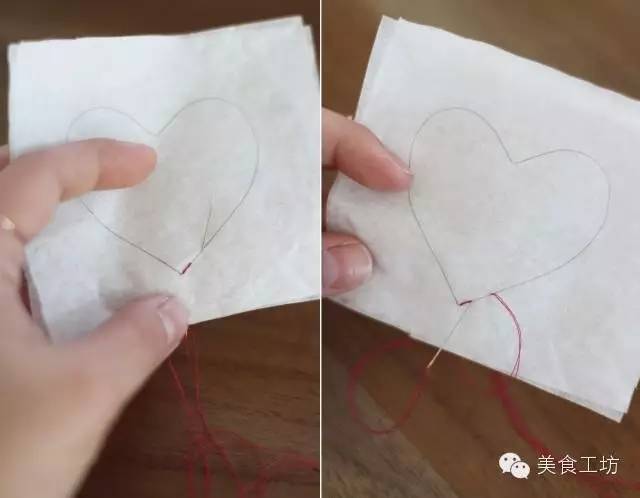1.从卡片上剪下一颗心型,摁在咖啡过滤纸上,在其正中心描画一个心型。