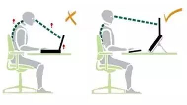 电脑设备应该放置在你手臂长度的位置,应低于你视线的15~30度;在你打字时,小臂应与大臂形成90度角,你的小腿应与大腿形成90度角,坐立时,挺胸,胸部和头部应在一条垂直线,每30分钟应站起休息缓解3~5分钟。