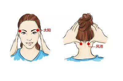 太阳穴:位于外眼角延长线的上方凹陷处。用两手拇指按揉太阳穴,可出现酸麻痛感,每次5分钟,每天1~2次。按揉此穴能醒脑明目,又有助于治疗偏头痛、三叉神经痛、面神经麻痹、感冒等。