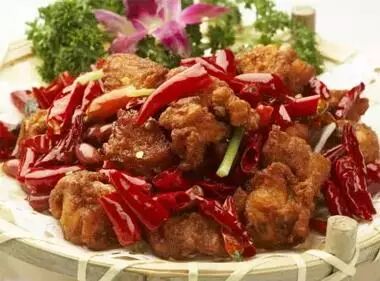 4.大火烧热油,放入姜、蒜片爆香,放入辣椒花椒,放入炸好的鸡块翻炒,撒入鸡精白糖和葱段炒匀。