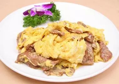 1 .牛肉切薄片,放入腌料(酱油、姜汁、酒、白糖、淀粉、花生油)拌匀,泡嫩后捞起,待用,打散鸡蛋后,放入盐拌匀;