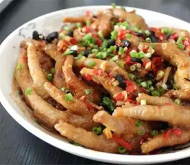 3.捞出凤爪加盐、胡椒、葱、红椒、大蒜末、豆豉、生粉、料酒、香油、生抽、老抽、蚝油充分抓匀;