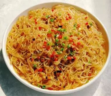 4.当变软出水时,下粉丝翻炒,放盐,让粉丝充分吸收炒出的水分;
