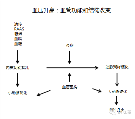 在过去十年中,定义高血压人群的策略是识别表型或所谓原发性高血压的病理生理特征。血压升高是高血压的表征,是由于动脉功能和/或结构改变而使动脉阻力和僵硬度增加导致的,并可导致左心室负荷增加(图1)。随着高血压导致的心血管系统改变,并发症随之而来,促进疾病事件的发生。在血压水平达到高血压标准之前血管异常就可能存在了,而血压升高又加速了这些血管异常。