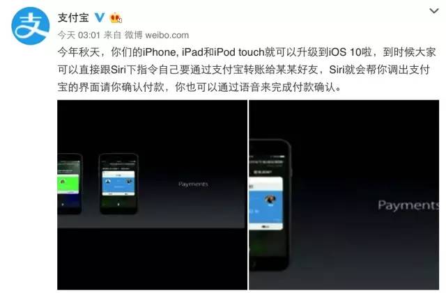 对于苹果将开放第三方应用的消息,支付宝也是反应迅速,凌晨就在微博上宣布支付宝将适配iOS 10,并且支持Siri语音控制……