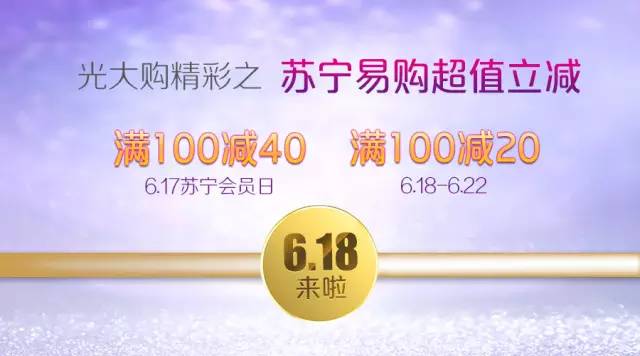 攻略一:苏宁易购会员日满100元立减40元6月17日,在苏宁易购购买实物商品时,首次使用光大银行(信用卡、储蓄卡)快捷支付,单笔订单支付金额满100元立减40元,最高减40元。同一用户活动期间限享受一次,当日限前2000名,优惠名额有限,先到先得,用完即止。