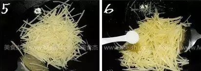 5热油锅,倒入土豆丝,翻炒约1分钟,如果感觉太干,可以适当洒点水6加入盐翻炒均匀,再加入白糖,翻炒均匀