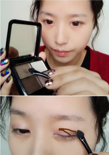 Step1:眼影。可先选择浅色的眼影,蘸取眼影后在手背上确认用量,调整到理想的浓度。用平涂的手法平铺上眼睑,然后选用深色眼影从睫毛根部开始描画眼影,靠近睫毛根处的眼影颜色最深,向上颜色减淡,色彩与色彩之间不能有明显的分界线,色彩要过渡自然,画出晕染效果。