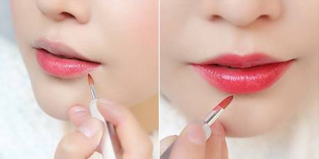 Step3:唇膏/唇彩。在涂唇膏时最好的办法不是直接涂在嘴上,应该采用唇刷。如果想让你的嘴唇看起来丰润,这里有一个小技巧,在涂抹时尽量把唇中部涂得丰厚一些然后再慢慢拉向嘴角,注意嘴角涂得一定要浅而窄,这样唇部看起来就非常的莹润可爱了。不喜欢涂唇膏的人可以只用唇彩就好。