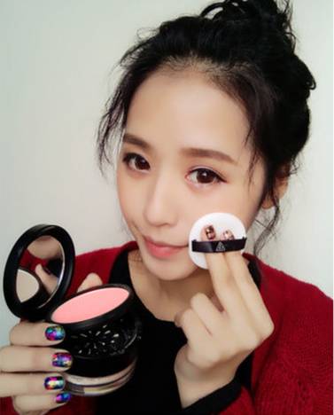 用大号粉刷沾取少量腮红粉从颧骨往太阳穴方向扫去,记得不要沾太多粉,不然会出现“高原红”的尴尬状况。如果需要修容的话,那么先上腮红,接着阴影,最后高光。