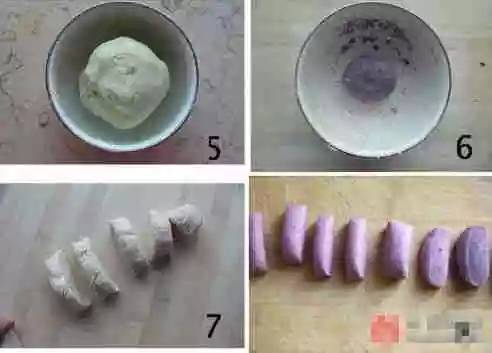 6 取三分之一的白面团加紫薯泥揉成紫薯面团