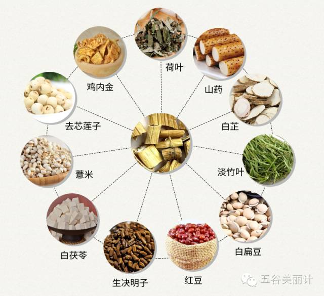 芦根、荷叶、山药、白芷、淡竹叶、白扁豆、红豆、生决明子、白茯苓、薏米、去心莲子、鸡内金、冰糖。