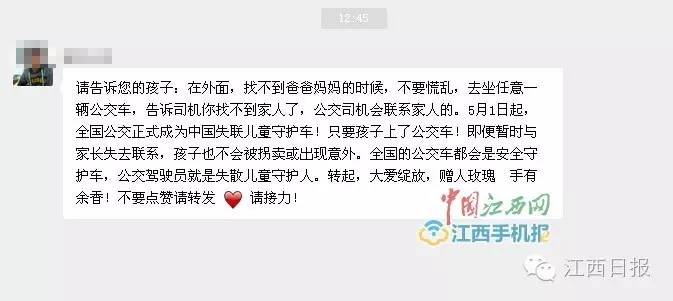 “请告诉您的孩子,在外面,找不到爸爸妈妈的时候,不要慌乱,去坐任意一辆公交车,告诉司机你找不到家人了,公交司机会联系你的家人的。5月1日起,全国公交正式成为中国失联儿童安全守护车。”近日,这样一则消息刷爆了市民朋友圈。