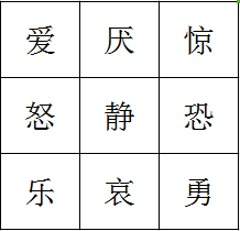 外围的八个格子中随机放置八种情绪(怒、哀、厌、恐、爱、乐、惊、勇),中间一个是“静”。意味着超越了一切情绪后所达到的平静、顿悟的心境,所有学员用静态和动态的情绪表达对应的情形。