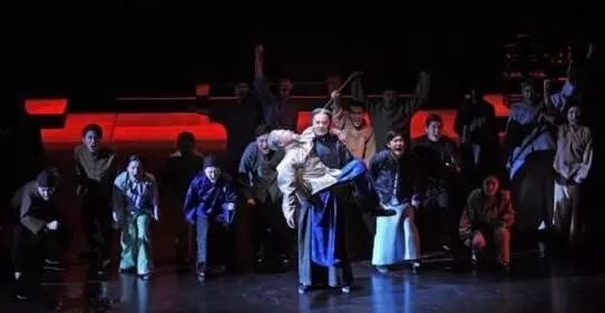 采用四维空间的变换,利用舞台的升降来表现时间及空间的变化,演员在舞台上即可完成换装。另外,原本在京剧演出中位于侧台的乐队也被别出心裁地搬到舞台上。在剧中,有京剧演员现场的表演,京剧锣鼓乐队演奏的音乐既是京剧演出的伴奏,又是话剧中的配乐。不得不看啊~