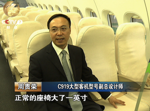 C919大型客机型号副总设计师周贵荣:首先919我们整个机型内部非常宽敞,给乘客的舒适性感觉非常好,第二采用了下拉式的行李箱,我们可以感觉到整个中间走廊的空间非常大。