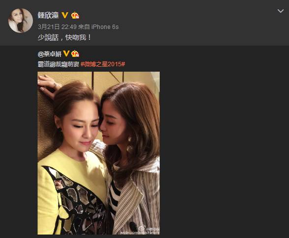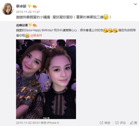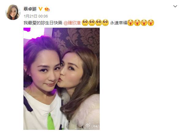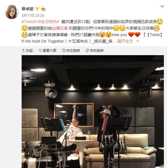 昨天是中国香港的女子双人歌唱组合Twins出道15周年,有粉丝早早地就为她们做出一个出道以来的视频集合,作为Twins成员之一的蔡卓妍阿Sa立刻转发微博,并留言:看到这个粉丝做的视频就泪奔了,谢谢亲爱的钟欣潼和亲爱的你们15周年的陪伴,大家都生日快乐。
