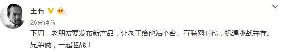 不过,在市场正对万科A即将复牌进行各种猜测和解读时,王石随即很快删除该微博。在下午13:04分时,王石再发微博,称“下周一老朋友要发布新产品,让老王给他站个台。互联网时代,机遇挑战并存。兄弟俩,一起迎战!”