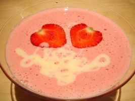 ① 将草莓(225克)、豆腐、蛋白、鲜奶全放入搅拌机内拌匀,取出后混和