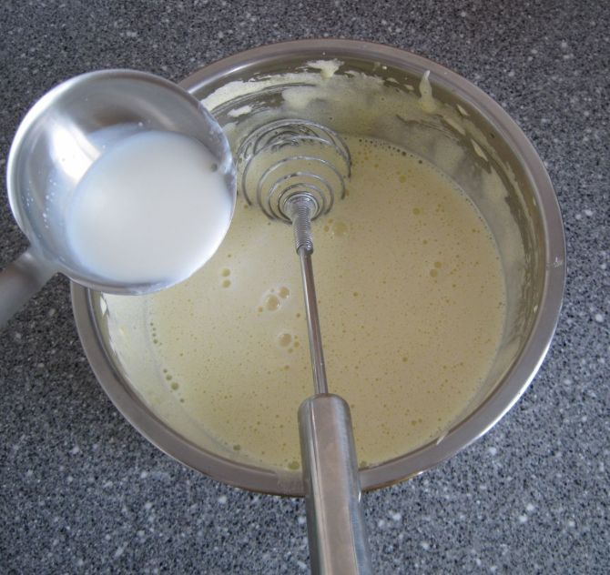 将煮好的牛奶,用勺子慢慢舀入打好的蛋液中,边倒边搅拌。(注意千万不能把牛奶一下子都倒入蛋液中,那样鸡蛋就会被牛奶烫熟、结块了)