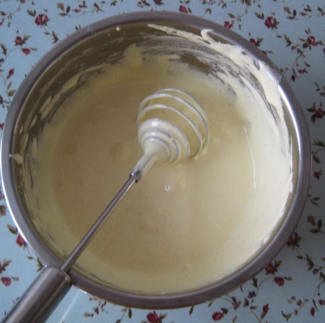 把白糖和蛋黄放在一起,用打蛋器打发,打成乳白色就可以了,就是这个样子的。当然没有打蛋器也可以用筷子,不过会很累,呵呵。