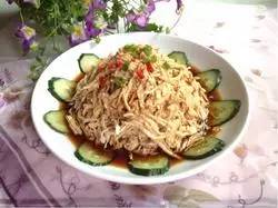 3.底部用黄瓜片围一圈,中间放上敲松的鸡肉丝。