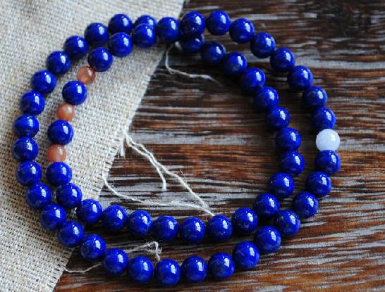 也就是说,不打磨成粉末的青金石,比如珠子什么的,是不可能掉色的。如果掉色,尤其是把别的东西都染蓝的情况,那就绝对不正常了,说明是有打蜡,或染色,或加色处理过的。