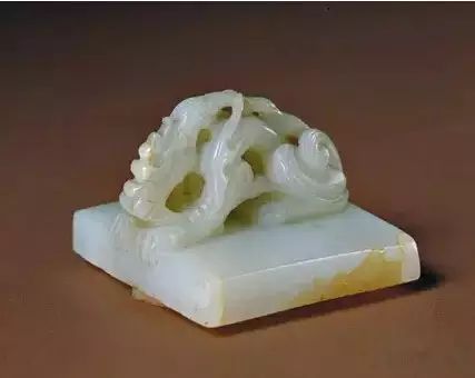 17、白玉龙钮押,元,长5.8cm,宽5cm,高4cm。 玉押方形,略厚,底面有凸起的阳文图记,上部为龙形纽,龙身短而似兽身,头上有角,披发,四肢粗壮,肘部饰上扬的火焰纹,三岐尾,中一岐长,上冲与头顶发相接