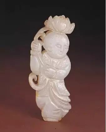 22、玉举莲花童子,宋,高7.2cm,宽2.8cm,厚1.1cm。清宫旧藏。 玉呈暗白色,雕一童子,著细袖衫、肥裤,外罩一长马甲,马甲上刻方格“米”字纹