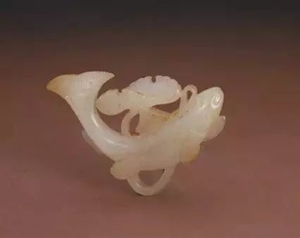24、玉鱼莲坠,宋,长6.2cm,宽4cm,厚0.6cm。清宫旧藏。 玉色白,表面有赭黄色斑