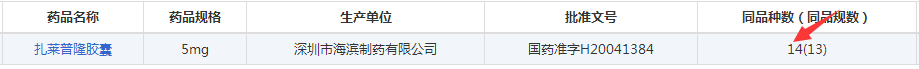 表格上的三种药品在CFDA国产药品数据库中查询到的生产批文均只有一个,图1为第一个药品扎莱普隆胶囊的在数据库的搜索结果截图。如果我们想当然的认为它们是独家品种,那就是被它们的外表给迷惑了。据药智国产数据(http://db.yaozh.com/pijian)查询,扎莱普隆胶囊生产批文有14个(13个药品名为扎来普隆胶囊,1个为扎莱普隆胶囊),鹿鞭回春胶囊;鹿鞭回春胶囊生产批文有3个(1个药品名为鹿鞭回春胶囊,2个为长白复尔春胶囊);吡拉西坦口服液生产批文有6个;阿司匹林维生素C肠溶片生产批文有13个。药智国产数据库数据与CFDA国产药品数据库数据完全一致,却能很好的通过查询结果中的同品种数(如图2)将伪独家品种判断出来。(图2为扎莱普隆胶囊在药智国产数据库搜索结果截图)。具体原因下面重点分析一下。