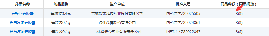 首先我们先分析一下出现伪独家品种的原因。众所周知,药品数据是大数据分析的一个重点难点。药品数据的多样性,让其在获取、使用、分析过程中都会有一些比较难解决的问题。就拿最基本的药品名称来说,药品通用名,别名,曾用名,名称出现的错别字,一些字符的表现形式不同,都会让同一个药出现多种药物名称。这也导致了在药品数据统计分析中难免会出现不准确的情况,伪独家药品品种也就这样产生了。CFDA国产药品数据库的药品名称也存在不少不规范的情况,如搜索上面提到的鹿鞭回春胶囊,只能出现一条搜索结果,与其是同一个药物的长白复尔春胶囊,无法出现在搜索结果中(长白复尔春胶囊更名为鹿鞭回春胶囊,部颁标准二十册)。药智国产数据库,对里面的数据都进行了精心处理,在保证数据与CFDA一致的同时,让用户的搜索结果变得更加准确全面。搜索同样的鹿鞭回春胶囊,药智国产数据库就能全面的搜索出三条结果(如图3展示),做到数据信息最重要的准确全面。用户可以在红色箭头所指同品种数(同品规数)一栏中读出药品相应的品种数进而分析出是否是独家品种。同时也可以在品种数的搜索框输入品种数量进行搜索,如输入区间1-1,便能把药品独家品种(品种数为1)搜索出来。