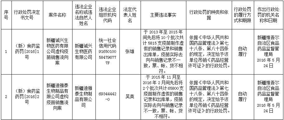 经查,新疆诚兴生物医药有限公司、新疆迪雅泰生物制品有限公司制作虚假的销售记录和销售出库单,疫苗实际去向与销售记录不一致,票、帐、货不相符,情节严重,其行为严重违反《中华人民共和国药品管理法》、《药品经营质量管理规范》有关规定。依据《中华人民共和国药品管理法》第七十八条和第八十四条的规定,经研究决定吊销上述2家企业《药品经营许可证》。