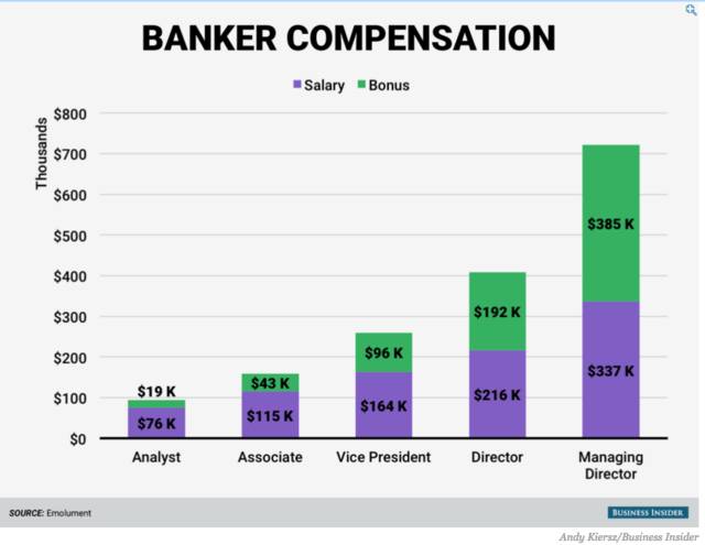 财经网站BusinessInsider曾经统计过华尔街投行各岗位的平均薪酬(下图),MD的薪酬差不多是初级分析师的10倍: